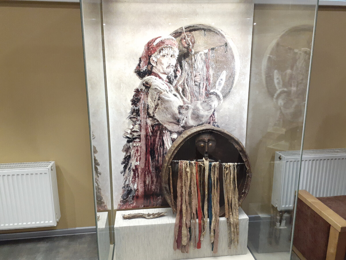 Итак, мы в национальном музее. Начало. Традиционная религия алтайцев - шаманизм. Есть верхний (небесный) мир, средний (земной) и нижний (подземный). Шамана выбирают сами духи и он общается с ними. Бубен шамана. Бубен сам шаман не изготавливал. Духи указывали шаману, из какого дерева и кожа какого животного должны быть взяты для изготовления бубна. Бубен изготавливали только мужчины по выбору будущего шамана. Заселение Горного Алтая русскими первопроходцами. Это были, в основном, старообрядцы. Жили замкнуто. Изба, хозяйственные постройки, огород. Двор был окружен изгородью. Идем дальше. Внизу - традиционное жилище алтайцев (аир). В 1993 году при раскопках кургана Ак-Алаха-3 на плоскогорье Укок была обнаружена мумия женщины. Ее назвали принцессой Укока или Алтайской принцессой. Мумия хорошо сохранилась, потому что была замурована в слое льда. Захоронение сделано в V-III веках до нашей эры. Реконструкция захоронения. Справа - кони. Сама мумия находится в саркофаге. Дни показов вычисляются