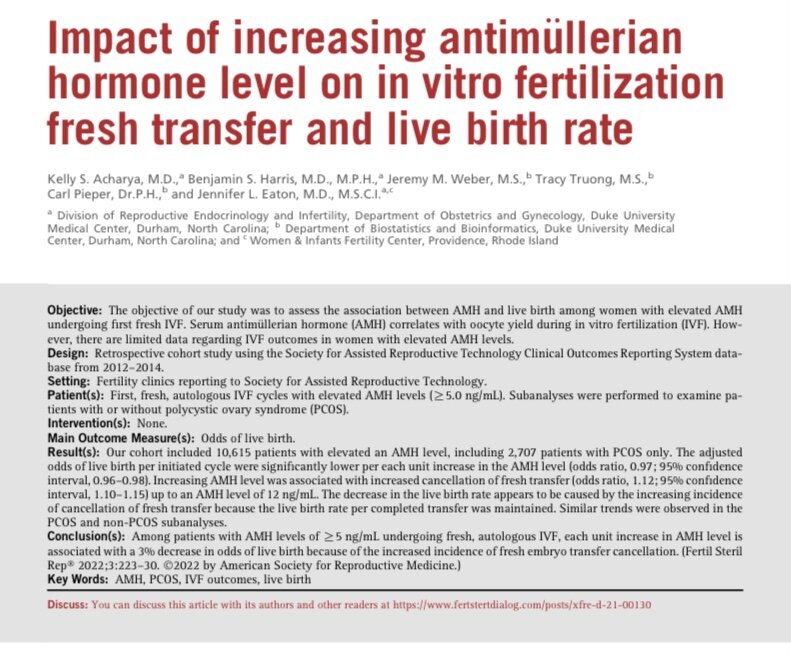 Среди женщин с повышенным уровнем АМГ повышение концентрации АМГ связано со снижением показателей живорождения и клинической беременности, а также с более высокими шансами отмены переноса свежих эмбрионов из-за опасений по поводу СГЯ. Эти результаты могут быть использованы для консультирования женщин с повышенным уровнем АМГ.
