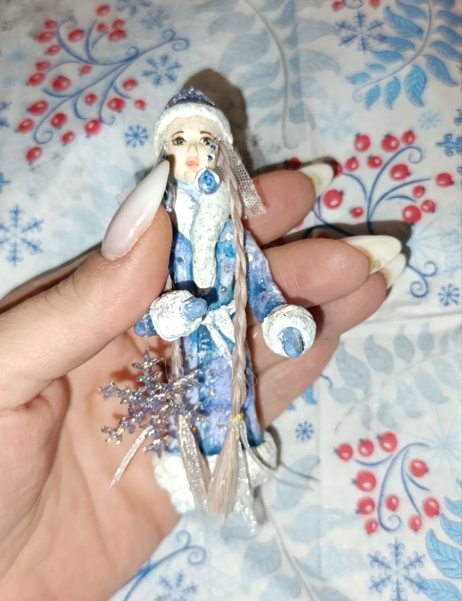 Я решила девочку снегурочке дать в ее несоразмерно-длинные руки снежинки. По правилам, Снегурочке почему-то положена ветвь дуба... Пока не поняла смысла , поэтому сделал снежинки. Можно дать в руки новогоднюю конфету или слепить мешочек-подарок, можно посадить белочку (особенно если лицо вы делали из воздушного пластилина и он у вас остался).