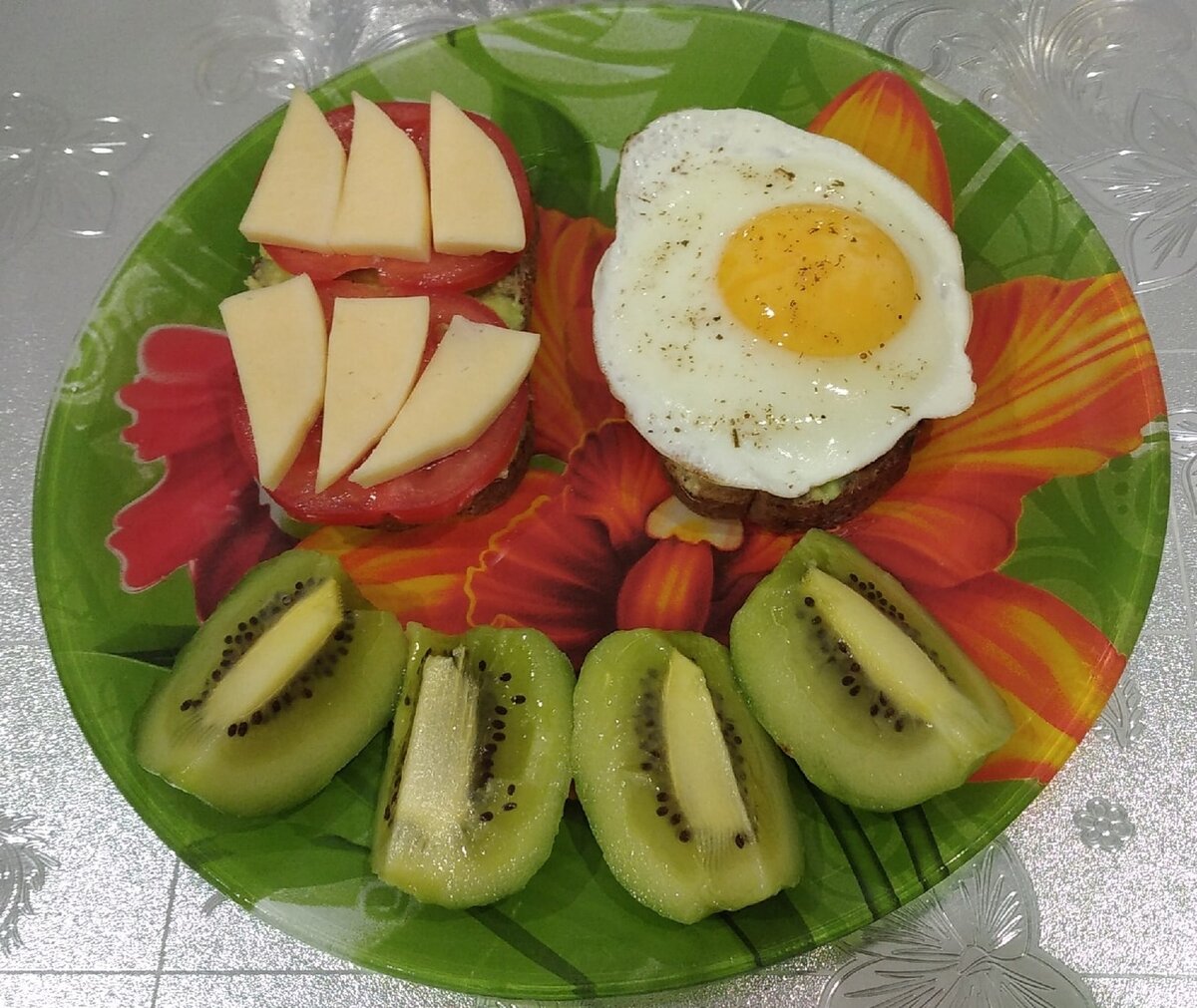 2 тоста из хлеба энергия здоровья (41г), натёртые чесноком (1г), намазанные авокадо (50г), сверху на одном бутерброде яичница (48г), пожаренная на а/п сковороде, на втором - 2 ломтика помидора (40г) и полутвёрдый сыр (21г); киви (129г) и сладкий чай (320мл) с лимоном
