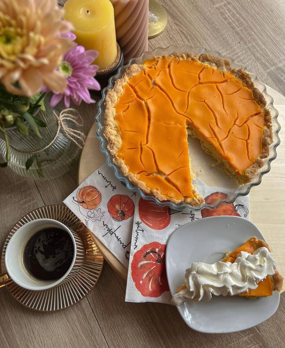 Ингредиенты: Для теста: 180г замороженного сливочного масла, 250г просеянной муки, 8ст.л. ледяной воды, щепотка соли. Для начинки: 400г тыквенного пюре, 100г сахара, корица, желатин. Приготовление: В Просеянную муку добавьте масло, холодную воду, Сахар, соль, замесите тесто, поставьте в морозилку в пленке. Спустя полчаса раскатайте из охлажденного теста лепешку, уложите ее в форму, сформируйте высокие бортики и снова поставьте в морозилку на 15 минут. Испеките корж в духовке, наколов предварительно вилкой. Минут 20 на 180 градусов. Для начинки: Сварите тыкву, блендером размельчите, добавьте сахарный песок. Желатин приготовьте на медленном огне и влейте в тыкву, помешайте, что бы желатин смешался с тыквой, затем добавьте корицу. Залейте корж начинкой и оставьте его остывать, затем поставьте в холодильник на 6 часов. Если хотите чтобы начинка потрескалась как на фото, то влейте на теплый корж начинку и поставьте в холодильник сразу. Можно подать со взбит
