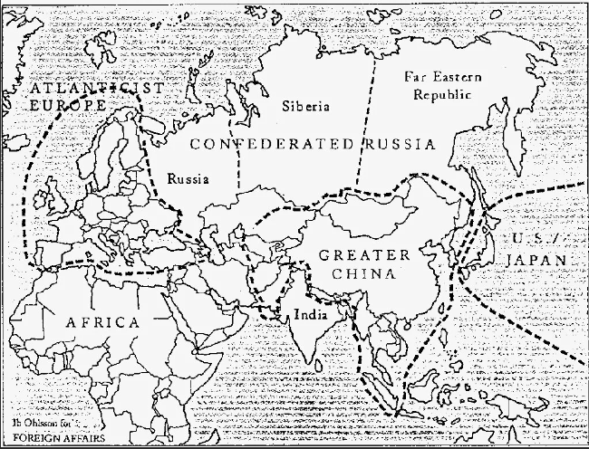 Вот передо мной лежит политическая карта мира. [4] Только очень уж необычны границы государств, нанесенные на ней. Соединенные штаты Америки и Япония обведены общей пунктирной линией. Вся Европа показана объединенной. Огромным пятном выделяется государство, носящее на карте название «Великий Китай». В его состав включены Монголия, часть среднеазиатских республик СНГ, Афганистан, Пакистан, Индокитай с частью Индонезии, Корея. Но еще более поразительны границы нашей страны. Вся она поделена на три части. Первая – «Дальневосточная республика». Но нет у нее целой полосы южных регионов, нет Благовещенска, Хабаровска, Владивостока. Все это отдано «Великому Китаю». Другая часть – «Сибирская республика». Она лишена юга Сибири, также прирезанного к Китаю. И, наконец, собственно «Россия» до Урала с западной границей между Курском и Петрозаводском. В состав этой территории не включены Псков и Санкт-Петербург. Они отданы объединенной Европе. Южная граница этой «России» проходит между Ростовом и Каспийским морем. Весь Северный Кавказ, Краснодарский и Ставропольский края, также отданы Европе. Частью этой Европы является на карте и Турция. Поперек всех трех частей мы читаем – Confederated Russia («конфедерированная (читай – расчлененная) Россия». «Сибирь» и «Дальневосточная республика», конечно же, – американские протектораты… [Заметка: Было бы неплохо подтвердить эту информацию, отыскав первоисточник]