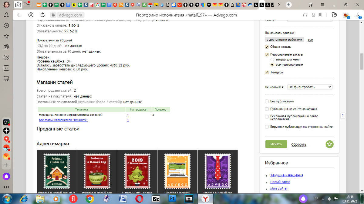 Сегодня начинаю новую рубрику. Как заработать в интернете и что может из этого получиться. Полгода я особо ничего не делала, а в Адвего не появлялась давно. Адвего - это биржа копирайтинга, где можно брать работу и выполнять ее. Зарплата копиться, когда вывести деньги, каждый решает сам. Вот такие грустные показатели у меня сейчас. Будем работать. На счету всего 328 рублей. Можно выводить сейчас, но я хочу накопить некую сумму, которая будет приятна. Буду публиковать, как продвигаются дела. Кроме того, потихоньку поднимается мой канал. Медленно, но верно. А быстро мне никто и не обещал. Все зависит только от моего усердия, причем и на Адвего и в Дзене. Да, сейчас копейки. Причем в наше время совершенно незаметные для семейного бюджета. Но это только начало. С этого дня начинаю рассказывать. Каждый день не обещаю, но минимум 3 публикации в неделю о заработке в интернете будет. Пожелайте мне удачи..