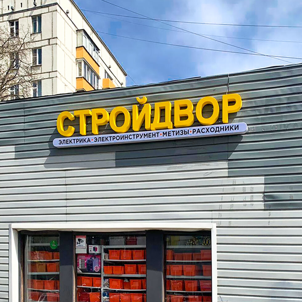 Вывеска "СТРОЙДВОР электрика, инструмент, метизы, расходники" — изготовление и монтаж.