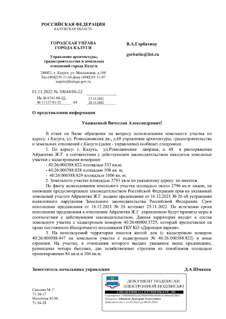 Уважаемый Владимир Владимирович! В то время, когда вражеские беспилотники бомбят Калужскую область (Шайковка), и в Калужские семьи приходят похоронки, калужские чиновники на уровне министров по прежнему не могут прекратить коррупционную деятельность. В частности это касается министерства природных ресурсов и экологии Калужской области. Еще 16 декабря 2021 года специалистами отдела по контролю за землепользованием управления архитектуры, градостроительства и земельных отношений города Калуги проверили факты, изложенные в обращении газеты "За правду и справедливость". В результате проверки выявлено, что гражданка Айрапетян Ж.Г., захватила участок земли в 2793 кв. м., расположенного на территории памятника природы регионального значения " Овраг Можайка". На факты сжигания отходов пластика от деятельности магазина "Фасоль", находящегося на территории земельного участка гражданки Айрапетян Ж.Г., в результате которого травятся дети школы и детского сада, расположенного через дорогу от м