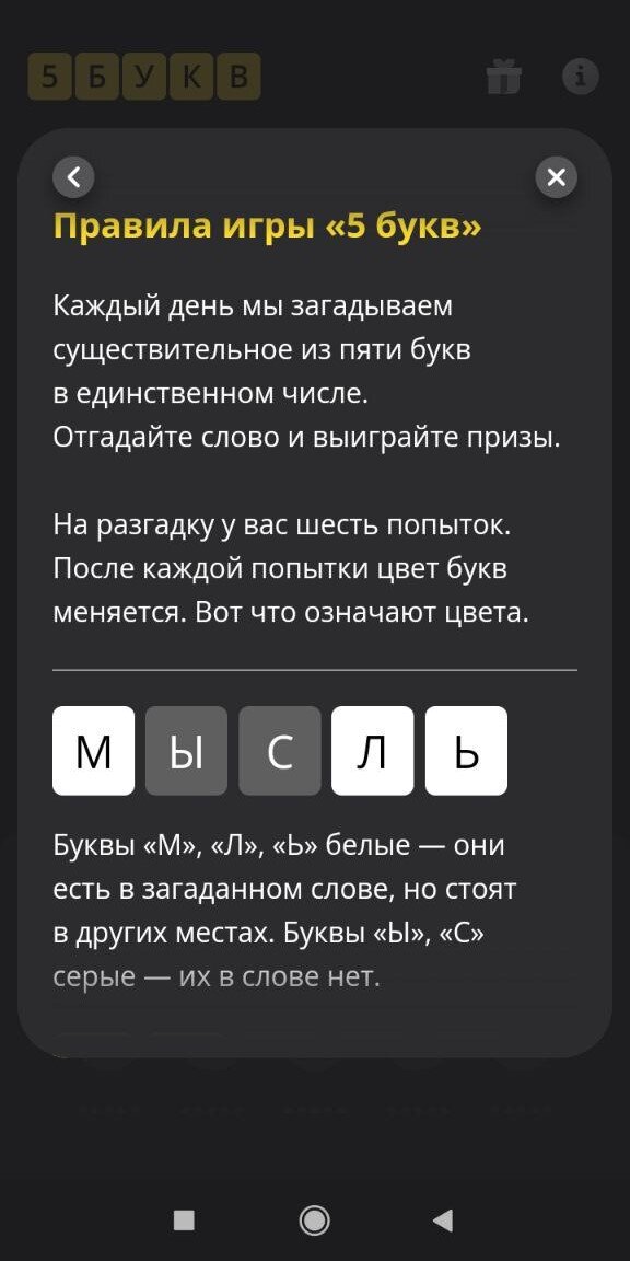 Суть игры - из шести попыток угадать слово (существительное из пяти букв в именительном падеже).