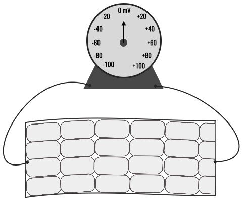 Вольтметр понятия не имеет, что происходит внутри клеток, так как мембрана клетки — это надежный изолятор. В состоянии покоя все клетки этой ткани имеют отрицательный заряд внутри и положительный — снаружи. Но вольтметр видит только положительный заряд, окружающий клетки: