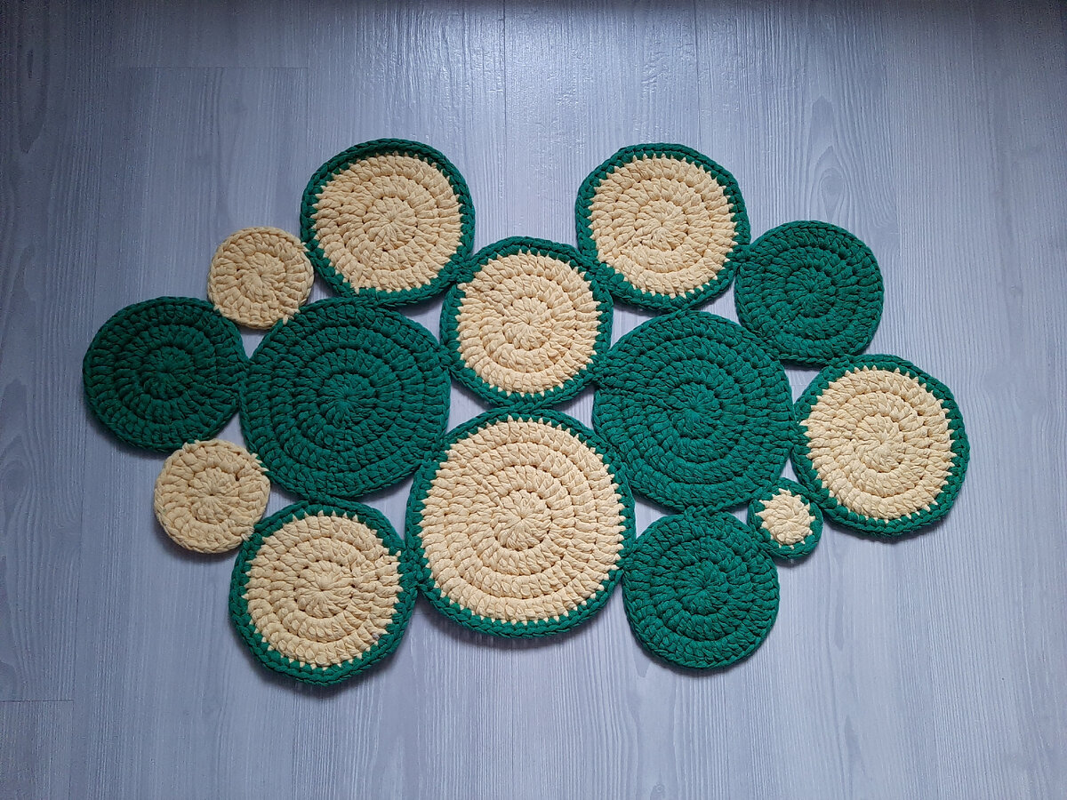 Коврик этот для детской комнаты. Мой ребенок очень любит жёлтый цвет. Связала его из ленточной пряжи, которая напоминает шнурок. Вязать из такой пряжи одно удовольствие, она мягкая, отлично держит форму. Вот такой необычный коврик получился, из круглых мотивов 2х цветов. Как Вам такая идея?