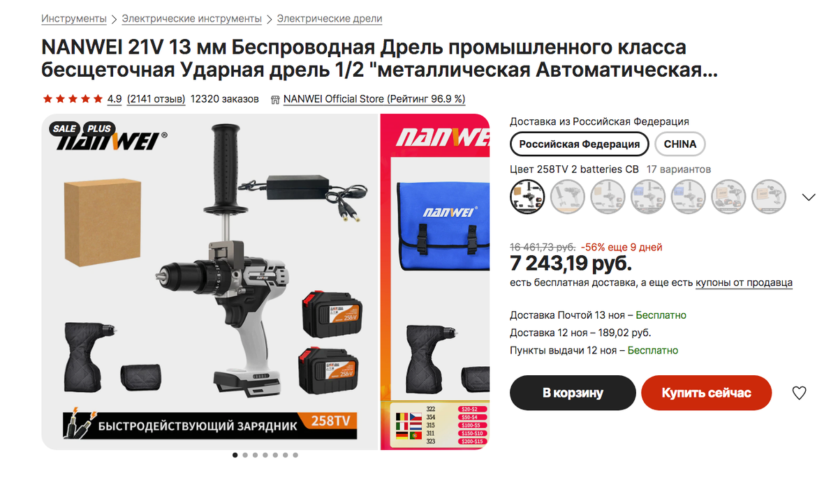 Поэтому, если вдруг Вам нужен помощник на зимней рыбалки для сверления множества лунок, то обратите внимание на данный шуруповерт. Читая отзывы, была указана цена покупки 9000 рублей. И хорошая новость в том, что на момент написания статьи, цена на инструмент существенно ниже!
