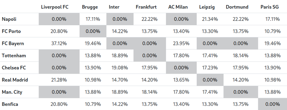 Ждем 7 ноября. Завершился групповой этап Лиги чемпионов – теперь мы знаем всех участников плей-офф. Жеребьевка состоится 7 ноября, но уже сейчас можно прикинуть вероятность встречи каждой из команд в 1/8 финала. «Бавария» и «Ливерпуль» – самая вероятная пара, такой исход оценивают в 37,12%. Все из-за того, что у «Баварии» сразу 4 исключения: «Айнтрахт», «Лейпциг», «Боруссия» и «Интер». Впрочем, у «Ливерпуля» столько же исключений, отсюда и высокие шансы именно такого расклада. Чуть меньше ограничений у «Наполи»: неаполитанцам не выпадут «Ливерпуль» (играли в группе), «Интер» и «Милан» (команды из Италии). Больше всего вариантов у «Реала» (из исключений только «Лейпциг») – остальные испанские команды пролетели мимо плей-офф. У «Бенфики» и «Порту» тоже по одному исключению: у первых – «ПСЖ» (попали в одну группу), у вторых – «Брюгге» (по той же причине). Как пройдет жеребьевка? Вспоминаем вместе с официальным сайтом УЕФА. • Для жеребьевки образуют две корзины: одна с победителями групп (