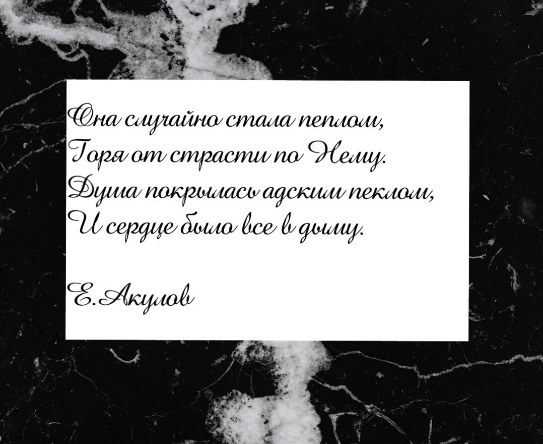 Она случайно стала пеплом, Горя от страсти по Нему. Душа покрылась адским пеклом, И сердце было все в дыму. Ну кто из нас не оступался, Кто не сгорал костром с любви? Она из тех, кто волком рвался С запястьем вышедшей крови. Не то что бы не уважали, Она - подобная ковру, Который безнадежно сжали И ноги терли (я не вру). Чего же стоило девчонке Любить лихого пацана? "Любовь" виднелась на ручонке: Порезы, слезы у окна, Еще и N-стаканов виски, Мартини, водка и вино, Заметки вечные, записки И жизнь - сплошное казино. Но невзначай она сгорела Сухой октябрьской листвой С отказов вечных то и дело, С любви несчастной, роковой.