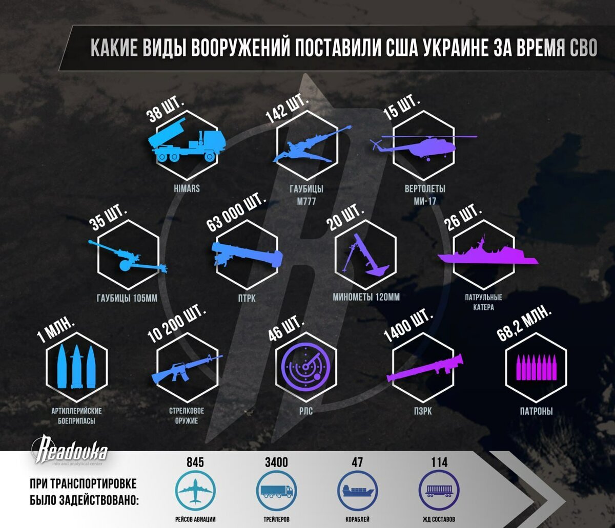 Кроме самого оружия было необходимо поставить и боеприпасы к нему. Ранее Readovka уже делала инфографику с поставками артиллерийских боеприпасов Украине. Теперь была обнародована информация по поставкам стрелковых снарядов – на нужды ВСУ Пентагоном было передано около 68,2 млн патронов. Обеспечиванием этих перевозок занималась зафрахтованная Пентагоном техника. Так, было задействовано 47 кораблей, 114 железнодорожных составов и 3,4 тыс трейлеров. Транспортная авиация совершила 845 рейсов. Всего с начала конфликта Украине было поставлено около 85 тыс тонн вооружений. Ранее Readovka писала о том, что офицер НАТО заявил о «логистическом кошмаре», царящем в ВСУ.