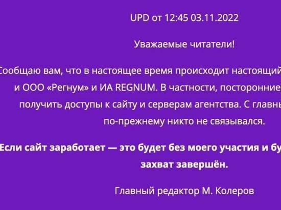 Главред агенства «Регнум» Модест Колеров опубликовал заявление о рейлерском захвате сайта и агентства. При попытке кликнуть на любой опубликованный материал сайта открывается заглушка с заявлением главного редактора. От его имени сообщается, что некие неизвестные люди пытаются получить доступ к серверам и сайту агентства, не вступая ни в какие официальные контакты с руководством СМИ. "Если сайт заработает, это будет означать, что захват завершен", говорится в заявлении. Накануне Модест Колеров сообщил, что агентство приостанавливает вещание в связи со сменой собственником руководства компании «без объяснения причин и целей». Автор: Андрей Степанов