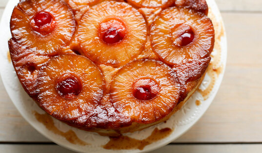 Вишня без косточек 50 г (заказать все продукты для приготовления) Как приготовить: 1. Растопите 75 граммов сливочного масла и смешайте его с коричневым сахаром. 2. Застелите дно формы для выпечки пергаментом. Сверху равномерно распределите смесь из растопленного масла с сахаром. 3. Затем аккуратно разложите кольца ананаса, а в серединку каждого кольца положите по вишенке