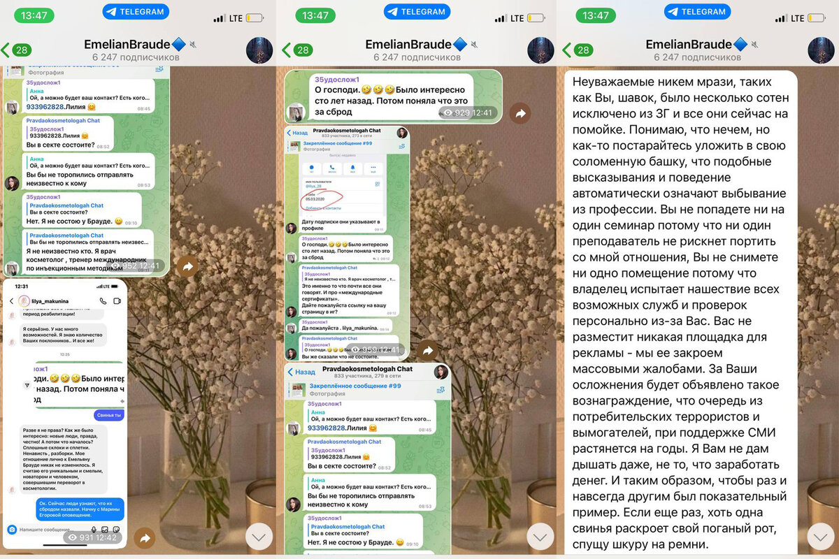 Емельян Брауде, которого в СМИ и социальных сетях называют лже-косметологом и мясником, угрожал бывшей ученице в публичном Telegram-канале. Косметолог Лилия Макунина в чате с коллегами выступила с критикой деятельность Брауде. «Было интересно сто лет назад, потом поняла, что это за сброд», - написала Елена про деятельность Брауде. Емельян же опубликовал скриншоты из публичного чата и личную переписку с Лилией, обвинив коллегу в лицемерии. «Неуважаемые никем м***и, таких как вы, ш***к, было несколько сотен исключено. Понимаю, что нечем, но как-то постарайтесь уложить в свою соломенную башку, что подобные высказывания и поведение автоматически означают выбывание из профессии. Вы не попадете ни на один семинар, потому что ни один преподаватель не рискнет портить со мной отношения. Я Вам не дам дышать даже, не то, что заработать денег. Если еще раз, хоть одна свинья раскроет свой поганый рот, спущу ш***у на ремни», - заявил Брауде. Лилия Макунина подтвердила корреспонденту «Подмосковья Сег