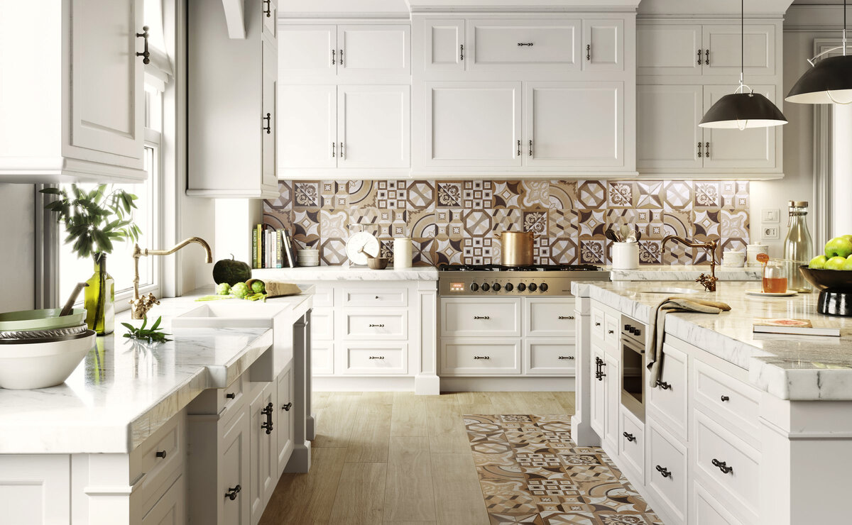 Как часть рабочей поверхности, кухонный фартук подвергается активному воздействию перепада температур, постоянной влажности, механическим повреждениям и это уже не говоря о попадании капель жира и масла. Кроме этого, являясь центральным объектом на кухне, он неизменно приковывает к себе все внимание. Поэтому так важно не только обезопасить эту зону от загрязнений, но и сделать так, чтобы фартук вписывался в общий дизайн интерьера, становясь его украшением. В этой статье мы рассмотрим основные принципы оформления кухонного фартука при помощи плитки и керамогранита. 1. Классическая плитка “кабанчик” Marazzi - коллекция LUME Самым простым и беспроигрышным вариантам оформления кухонного фартука является использование классической плитки “кабанчик”. И если традиционная кирпичная укладка кажется заезженной и однообразной, то свежая и более сложная техника ёлочка заметно преобразит интерьер. Также современно будет смотреться вертикальная и диагональная раскладка плитки.
