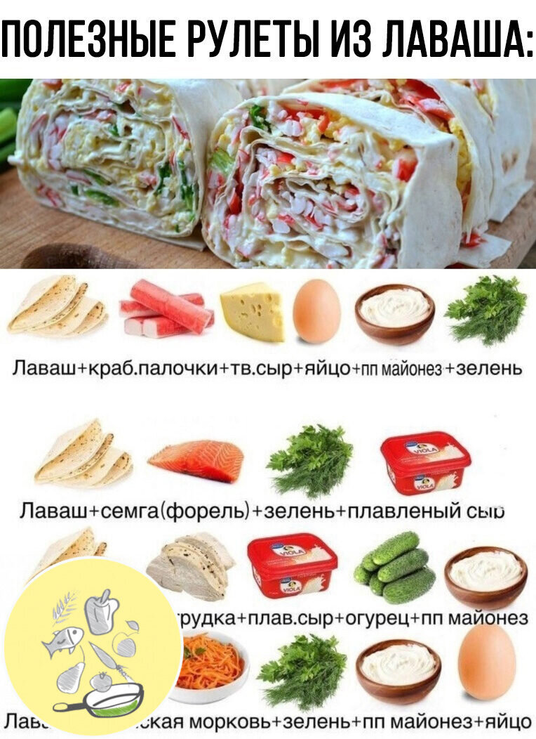 Все знают, что лаваш-это низкокалорийная замена хлеба. А приготовить из него можно что угодно. От рулета до пирога. Я в праздничные дни тоже буду готовить рулет. И обязательно поделюсь с вами рецептом. А пока для вас небольшая шпаргалочка😉.