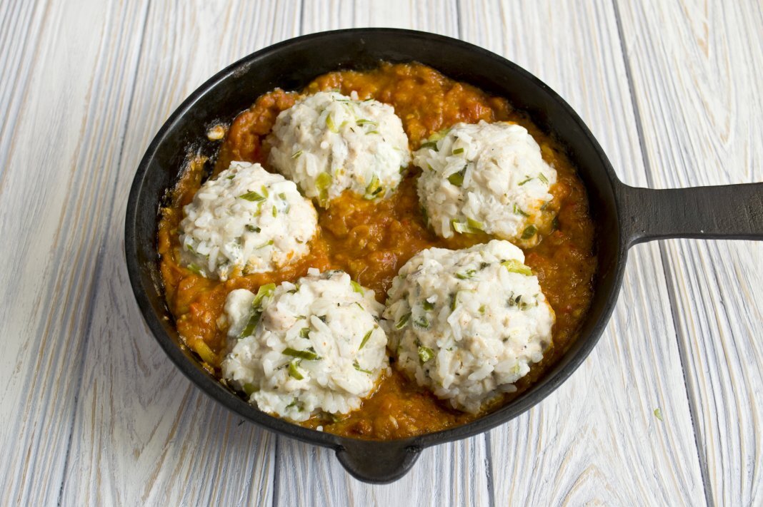 Ингредиенты: 1 стакан риса, 1 стакан молока, 1 1/2 стакана воды, 1 ст. ложка сливочного масла, 1 яйцо, 2 ст. ложки растительного масла, по 1 ст. ложке измельченной зелени петрушки и укропа, белый молотый перец, соль, 2 cm. ложки панировочных сухарей. Для ветчинного мусса: 500 г ветчины, 100 г густых сливок, красный молотый перец, соль.