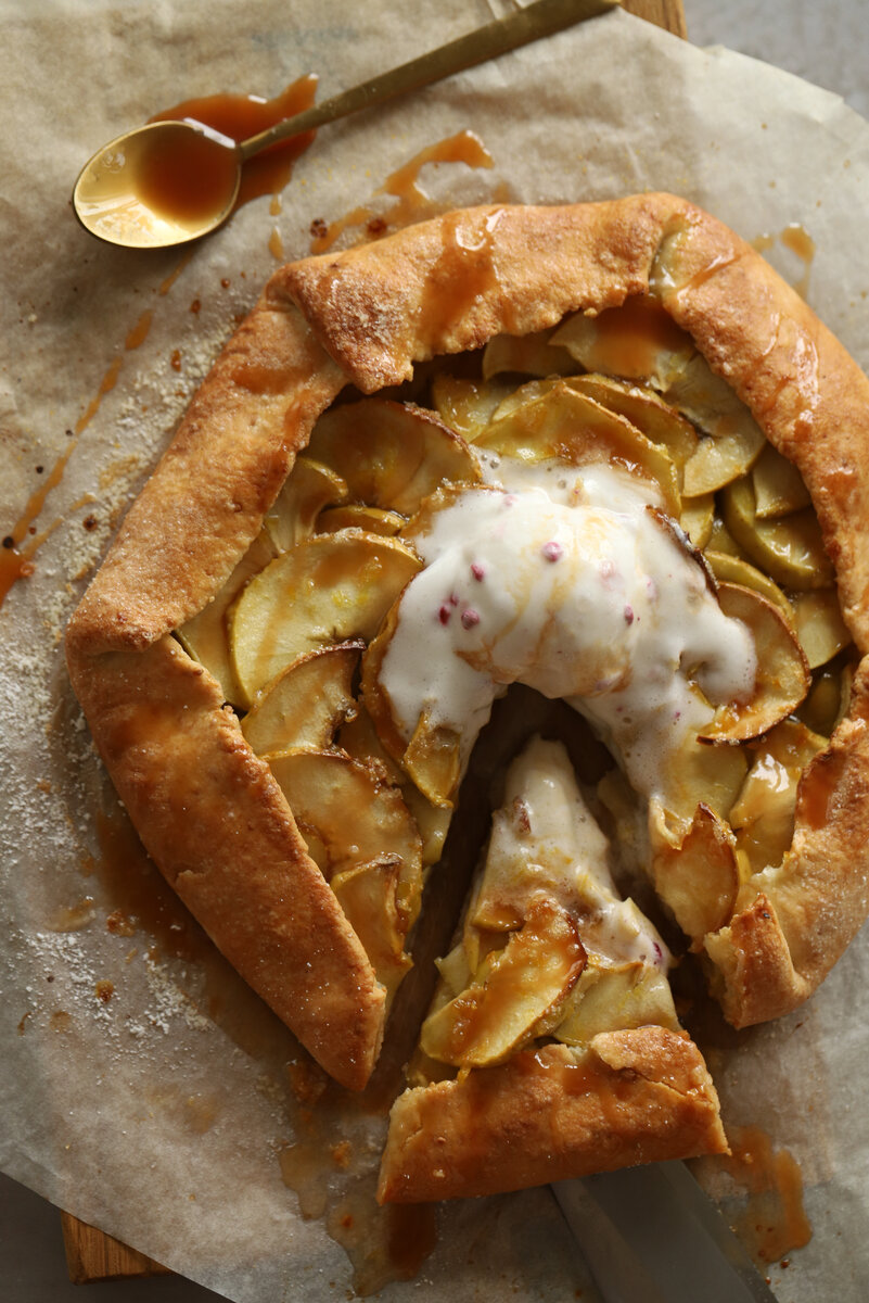 Рецепт великолепного, моего любимого творожного теста для галет я публиковала в этой статье. Сейчас делюсь с вами простейшим рецептом начинки. Начинка: Яблоки, гренни смит или симиренко 250 г 70 г сахара + 1 чл крахмала или 3 столовых ложки карамели Рецепт идеальной карамели здесь! Цедра половины лимона или апельсина Все для начинки перемешать. Тесто раскатать в круг 25-30 см. Сформировать галету. По желанию, смазать яйцом. Выпекать в заранее разогретой духовке при 180 градусах 40 минут. Вот так, быстро и просто, получается вкуснейший пирог! А если подавать с мороженым - мммм... Десерт как из ресторана.