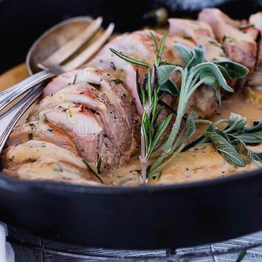 Ингредиенты: 50 мл оливкового (или другого растительного) масла, 5 зубчиков чеснока, 2 ст.л свежего розмарина, 1/4 стакана листьев шалфея, 600 г свиной вырезки, 250 мл сухого белого вина, 100 мл куриного или овощного бульона, 100 мл густых сливок, соль, перец. ■ В глубокой сковородке нагрейте масло на среднем огне. Обжаривайте свинину ~ по 5 минут с каждой стороны, затем переложите на тарелку.