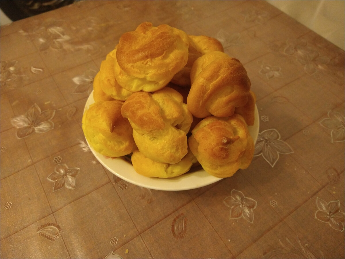 Нежные пирожные с мягкой начинкой, воздушные и очень вкусные. Ваши дети будут просить добавки. Как всегда все очень просто и быстро, отлично подойдет чтобы удивить гостей которые вот вот должны прийти. Для приготовления 25 шт вам понадобится: 1. Вскипятим воду и добавим к ней соль и сливочное масло. Убавляем огонь на минимальный и просеиваем муку к нашему кипятку постоянно помешивая, смесь начнет завариваться и густеть. Прогреваем смесь на медленном огне постоянно помешивая еще пару минут и снимаем с огня. 2. После того как наша основа для теста немного остынет вмешиваем в нее яйца по одному хорошо вбивая их, должно получится гладкое блестящие тесто, слегка текучее, но в то же время держащее форму. 3. Отсаживаем профитроли на противень при помощи кулинарного мешка размером с грецкий орех и отправляем в предварительно разогретую до 200 градусов духовку на 20-25 мин, до румяного цвета. Во время выпекания нужно выключить конвекцию и категорически нельзя открывать дверцу духовки на всем