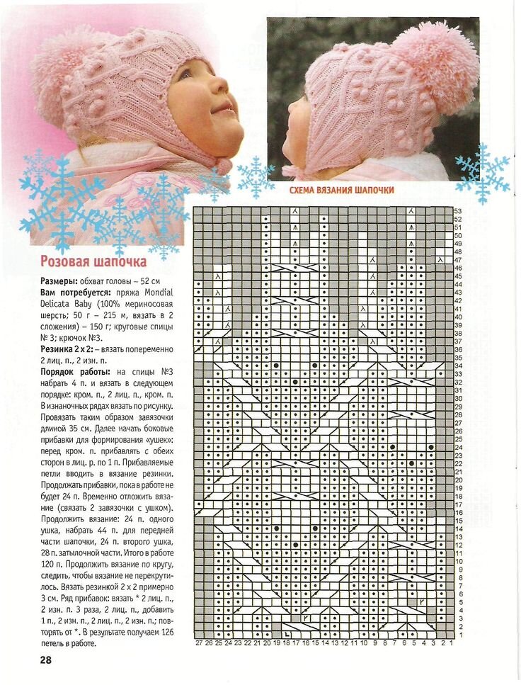 Описание шапочки для девочки дано на возраст a) 1год -3 года и b) 3-6 лет. Размеры – a) 47/50 и b) 50/53 см. Снуд a) ширина (окружность) – 44/47 см, высота – 22-23 см. и b) 47/50 см., высота – 23-25 см.