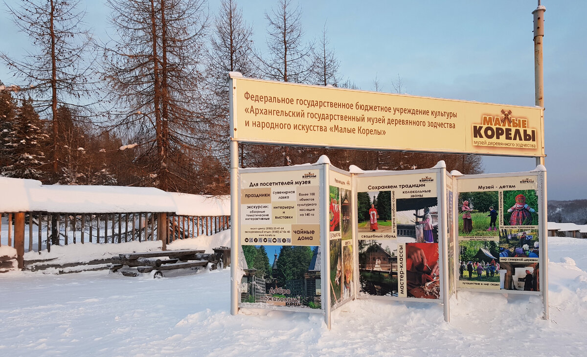Скоро снова наступит зима и украсит землю белыми узорами! Особенную красоту, разумеется, можно будет увидеть в лесу - настоящем русском северном лесу в музее деревянного зодчества под открытым небом Малые Корелы, который находится под Архангельском. Расположился он на красивых холмах, прямо среди северной тайги. Сюда привезли традиционные северные дома из разных районов Архангельской области. Зимний день на севере короток, так что приезжать нужно "на рассвете", в 10 утра перед вами откроются решетчатые двери. А за ними уже видны сказочные строения - маковки шатровой колокольни и лопасти деревянной мельницы. У дверей можно нанять лошадку , которая провезет вас по части музея, но это не обязательно, даже лучше пройтись пешком, ведь вас привезут обратно. От ворот идите прямо по дороге, она выведет вас к колокольне из села Кушерека, Каргопольского района. Рядом стоит огромный красивый дом Пухова из деревни Большие Халуи того же Каргопольского района. В нем работает сувенирная лавка