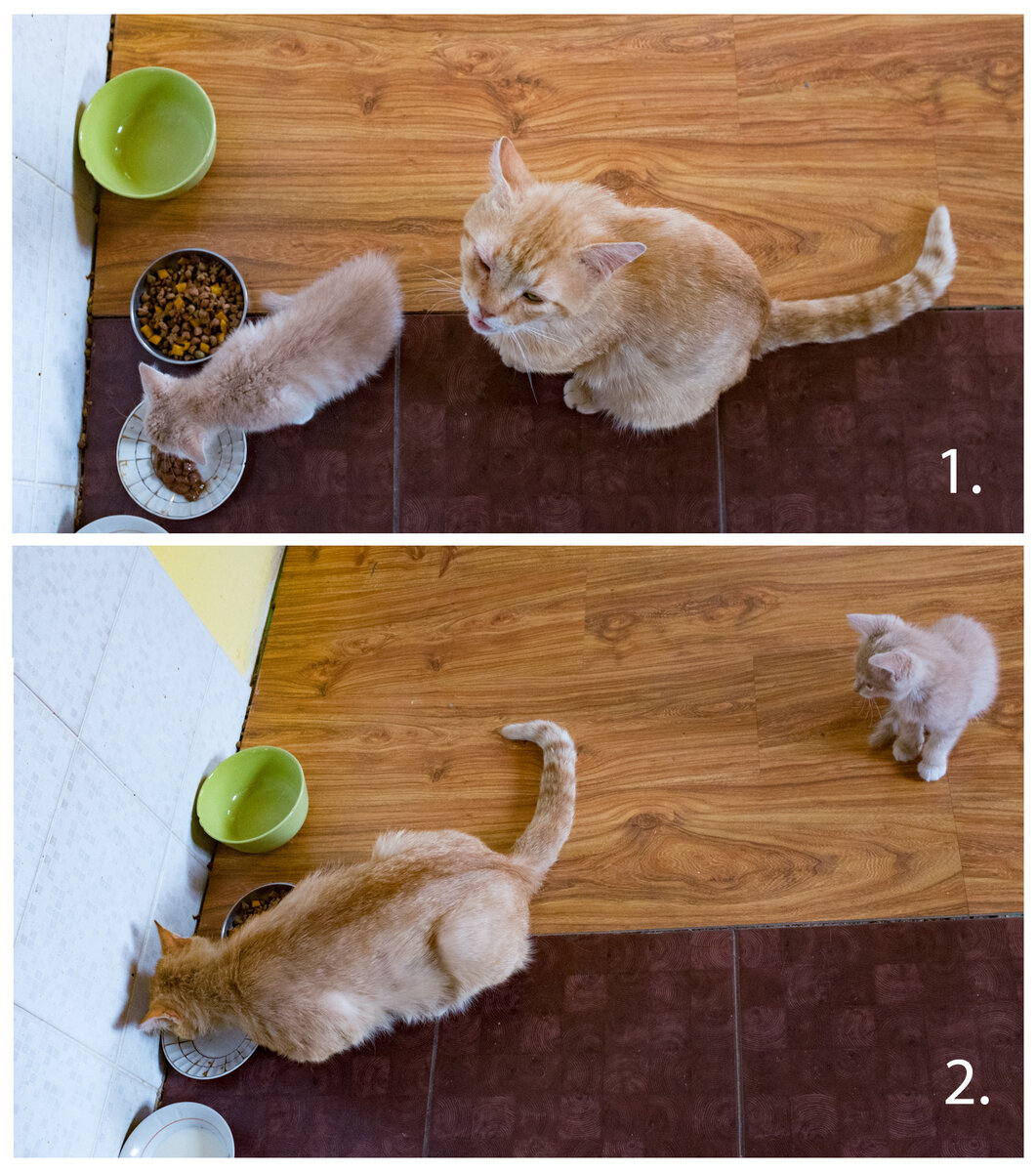 Такая мирная у Бени с котёнком история. Друг от друга не отходят. Хорошо всё же, когда у тебя есть дом в деревне и дедушка там же! Правда, потом выяснилось, что дедушка всё же не бескорыстен. Когда котёнок наедается и отходит, Беня всегда неожиданно прогуливается рядом с кормушкой и делает вид, что прогуливается. Я тут водички пришёл попить, типа. Миски с водой и едой рядом стоят. А когда про Беню забыли, он р-р-р-раз! И детскую еду быстро подъедает. Он такую вреднятину обожает. Для него это - Кошачий Макдональдс.