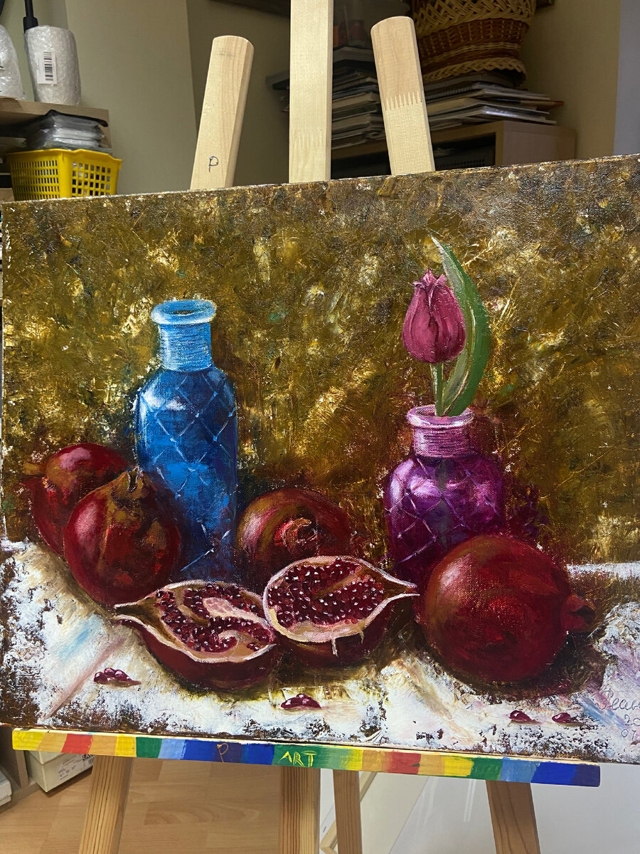 Она меня дико мотивирует и помогает создавать уникальные шедевры. Я часто обращаюсь к гранату — как к вдохновению и мотивации. Что-то чарующее когда-то меня привлекло, наверное, аромат 😉 На этой картине я воплотила гранат в самом его лучшем обличии, разрезанном, сочащемся и таким вкусным, что хочется съесть. И рядом такие лёгкие и тонкие листья тюльпана, которые колышутся от ветра. Такая картина отлично украсит вашу обеденную зону и станет ярким элементом интерьера 🤍 #стелла #картина