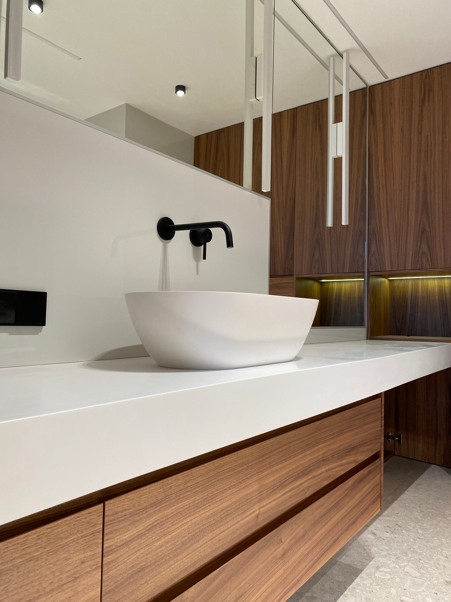 В этом проекте столешница выполнена из акрилового камня. Большая толщина и белоснежный цвет идеально подошли к дизайнерской визуализации, а кремовый цвет самой мойки очень дополняет визуальную картину.