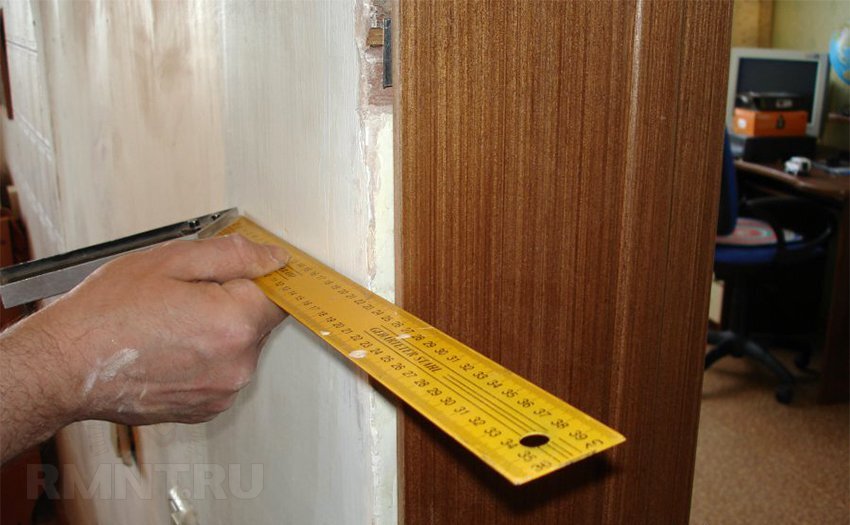 Вертикальные доборы замеряются и устанавливаются после закрепления верхней перекладины. По угольнику, приложенному к торцу дверной коробки, устанавливается разница в высоте, полученные размеры переносятся на разметку. Доски боковых откосов желательно делать на 1–2 мм длиннее, чтобы была возможность точно подогнать деталь наждачным бруском.