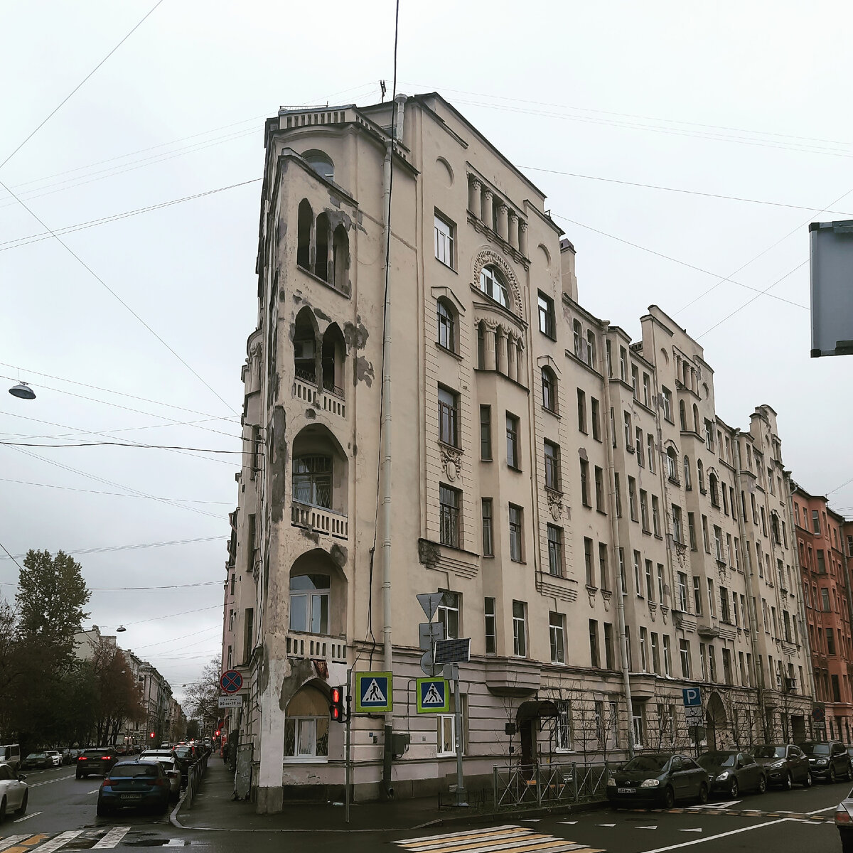 Когда-то это был современный и фешенебельный дом. Он возвышался светло-голубой махиной среди относительно пустынных улиц. Кругом были лишь низкоэтажные домики, а из окон шестиэтажного статного красавца, за столько необычную форму прозванного кораблём, можно было увидеть набережную Карповки и Иоанновский монастырь. С тех пор прошло более 100 лет. Местность кругом застроилась, улица Широкая стала улицей Ленина, да и город уже трижды поменял свое имя. Создатель дома, инженер-технолог Александр Маркович Эрлих, давно сгинул в бурном море событий. Его судьба и даже дата смерти неизвестны. А вот его творение продолжает радовать нас необычным сочетанием готики и модерна, изящными формами и остатками былого роскошного убранства. В доме два парадных входа, один с улицы Ленина, другой с Газовой. Оба они ведут в некогда роскошный холл первого этажа, где ещё сто лет назад был установлен лифт, обитый бархатом, а гостей встречал швейцар. Также в холле был установлен телефон - главное новшество то