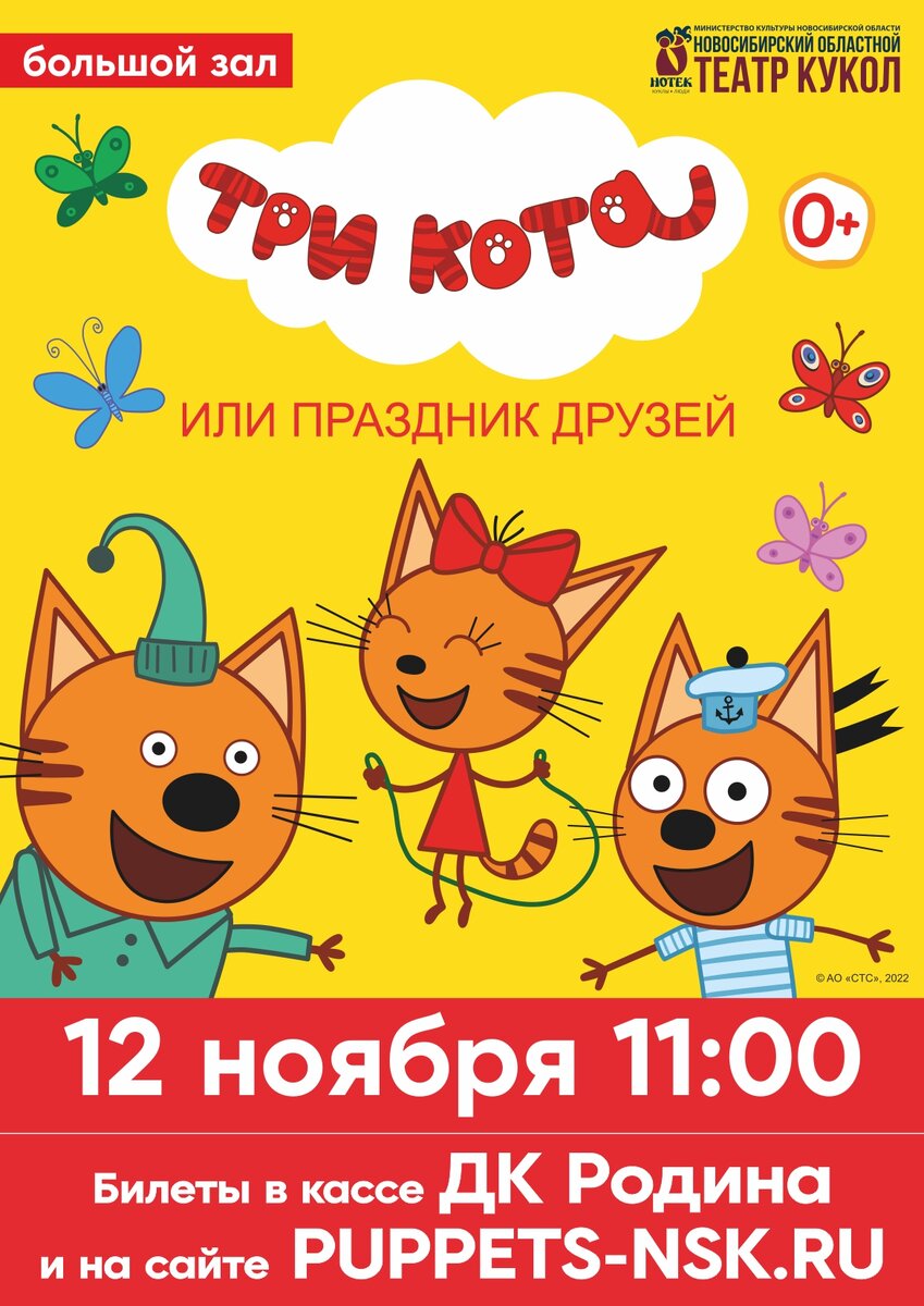 «Три кота и праздник друзей» - спектакль для малышей Новосибирского театра кукол. 12 ноября в 11:00 час. Дворец культуры «Родина», большой зал Продолжительность: 30 мин Постановочная группа: Режиссер – заслуженная артистка РФ Ольга Гущина Художник – Анна Гуляева Композитор – Владимир Натанзон Спектакль «Три кота и праздник друзей» Это история из жизни друзей - трёх любознательных котят — Компота, его братика Коржика и их сестрёнки Карамельки. В их большой и дружной семье жизнь никогда не стоит на месте, она насыщена событиями! История о том, как самая обычная прогулка по лесу может стать настоящим приключением, подарить новые встречи и новых друзей. В спектакле котята вместе с маленькими зрителями подружатся с Ёжиком, Сорокой и тётей Пчелой! Спектакль участвует в программе «Пушкинская карта». Билеты можно купить в кассах Дворца культуры «Родина». И по ссылке https://puppets-nsk.ru/buy-tickets/#/buy/18100 МАУ «Дворец культуры «Родина» г. Бердск, ул. Микрорайон, 48Б Сайт: https://ro