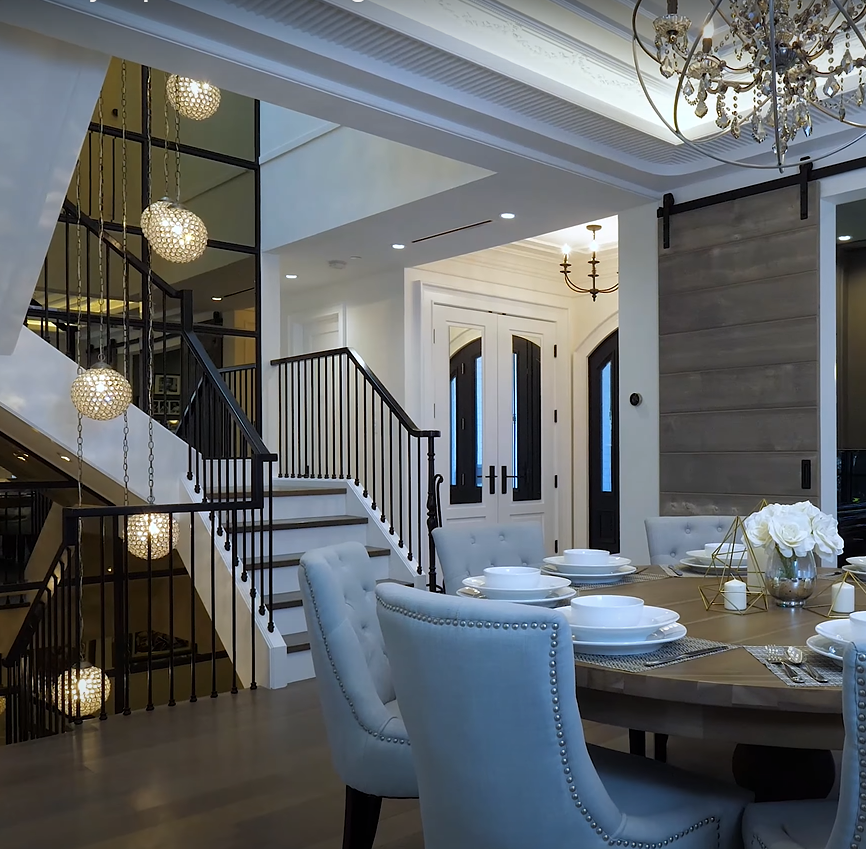 В этом доме такими элементами стали люстры на длинных металлических цепях в лестничном пролете, современные металлические светильники над островом на кухне, металлический фартук и короб для вытяжки. Классический же стиль предполагает симметрию, единое цветовое решение, приглушенные тона, изящную мебель, наличие лепнины и хрустальные люстры.