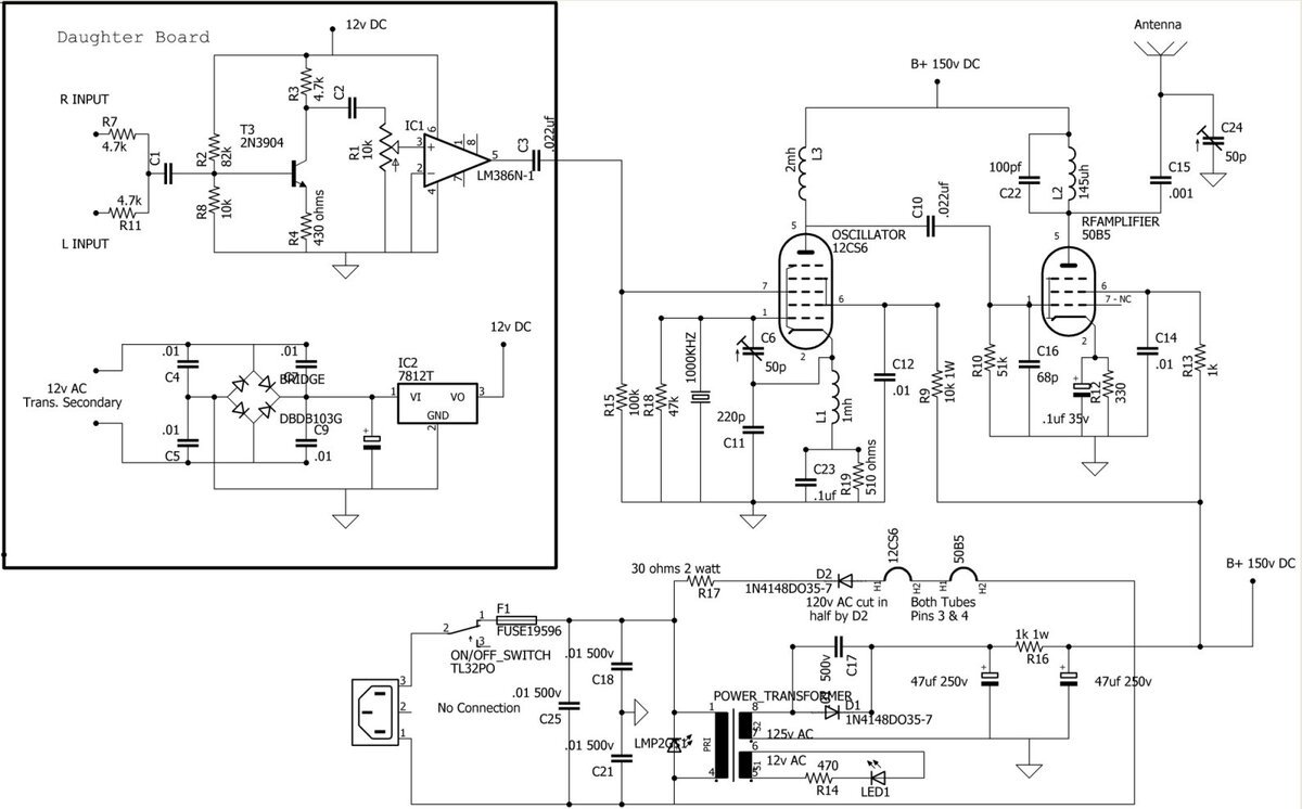 Добрый день дорогие друзья Мы на моем канале продолжаем рассматривать интересные для повторения нашим радиолюбителям конструкции зарубежных радиолюбителей, первую часть вы можете посмотреть ЗДЕСЬ. Сегодня мы рассмотрим Средневолновый двухламповый передатчик, описание этого передатчика я нашел на одном из зарубежных радиолюбительских форумов. Давайте посмотрим на его схему. Давайте взглянем на его схему. Для подробного рассмотрения ее можете открыть в новом окне Задающий генератор с кварцевой стабилизацией на 1000кГц собран на гептоде 12CS6, а выходной усилитель на пентоде 50B5. Выходная катушка L2 намотана на картоном каркасе диаметром приблизительно 18мм и количество витков приблизительно 100, проводом ПЭЛШО 0,25мм (диаметр катушки и количество витков мое предположение, но думаю что нужно намотать 150 витков, а потом отматывать и измерять индуктивность до нужного значения)) и имеет индуктивность 145 мкГн. Выглядит катушка так. Для получения ано