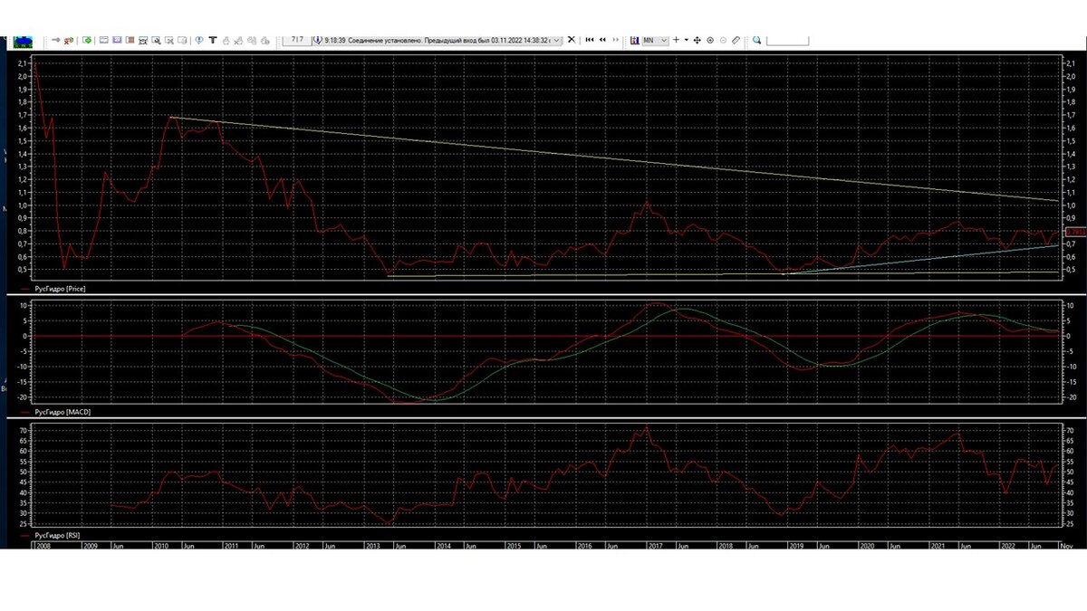 Как показывает история дивидендов РусГидро выплаты растут, только в 2022 году не росли и не падали. На 2023 год компания РусГидро планирует заплатить дивиденды в размере 0,0729 рубля за одну акцию. Как видим, даже в тяжелое время для страны компания РусГидро прибыль растет, и компания может себе позволить увеличить выплату дивидендов своим акционерам. Такая ситуация позволяет акции РусГидро держаться на хороших уровнях и не падать, хотя 24 февраля 2022 года сказалась на акцию РусГидро. Компания РусГидро смогла остановить просадку и стабилизировать свое положение и вернуться практические на уровни 2021 года. Как показывает технический анализ до конца года не теряет надежду на продолжения движения на вверх. Если политическая и экономическая обстановка в стране и в мире не будет ухудшаться, будет оставаться в таком состоянии, как сейчас, движение на вверх будет продолжаться. Месячный график показывает быки будут стараться концу года подойти к уровню 0,86, но индикатор RSI и MACD начали д