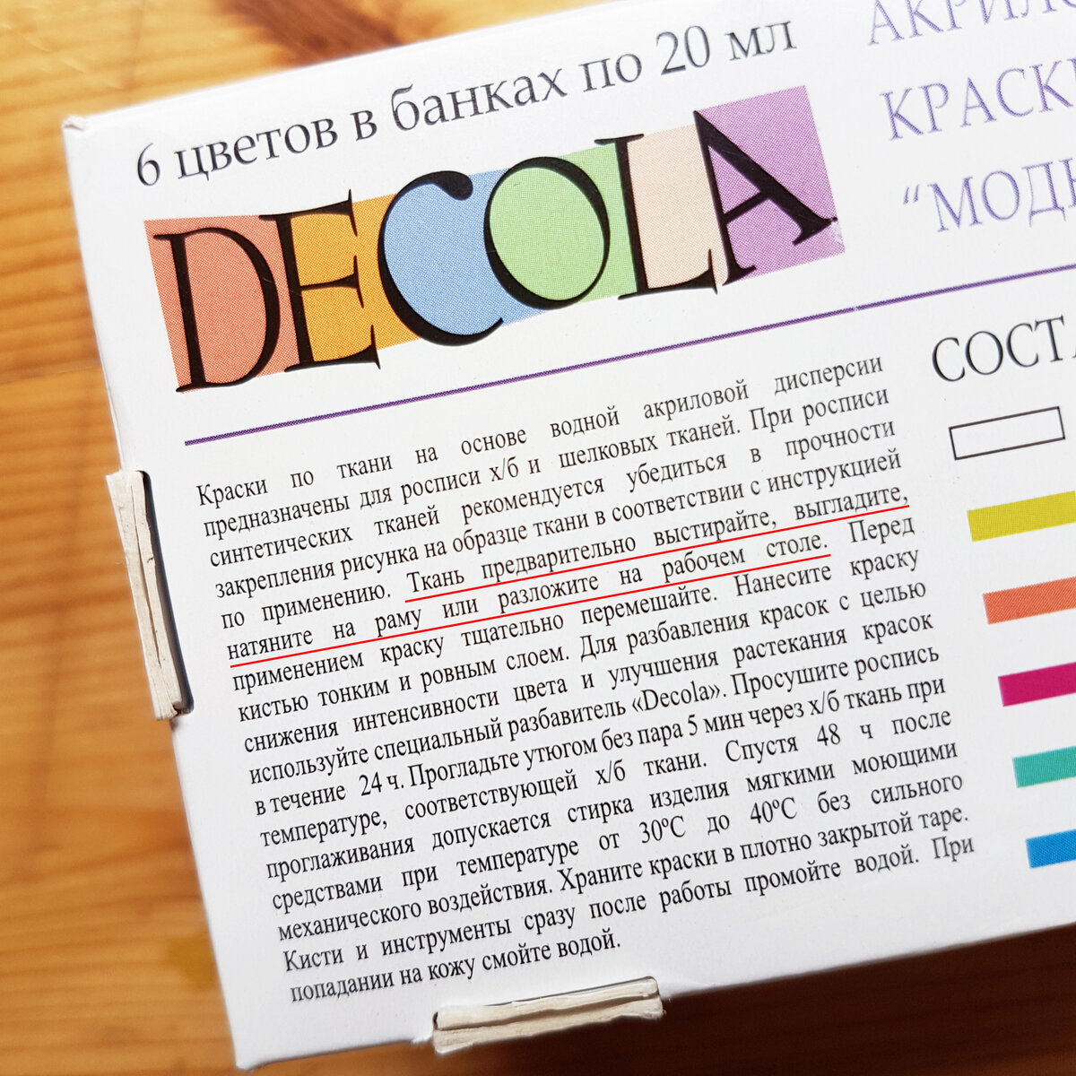 Освоить роспись по ткани может абсолютно любой человек, даже если не умеет рисовать. Можно использовать трафареты или переводить рисунки на ткань, главное иметь желания. Для начала нужно хотя бы ознакомиться с тканями, красками, техниками и материалами. Что нам нужно? Выбираем изделие (например футболку). Лучше всего подходят изделия из натуральных тканей. На них краска хорошо держится, чего нельзя сказать о синтетики. Покупаем краску. Акриловые краски по ткани они так и называются фирм много, но я предпочитаю фирму Decola. Кисти. Для росписи по ткани лучше всего подходят синтетические кисти. Кусок картона и пленка. Это нужно чтобы краска не пропитала футболку на сквозь. Канцелярские зажимы Этапы росписи по ткани. 1. Прежде чем начинать роспись изделие нужно постирать и погладить чтобы оно дало усадку и не было пылинок которое нарушит сцепление краски и ткани. 2. Вставляем картон с пленкой под поверхность на которую мы будем наносить рисунок и закрепляем канцелярскими заж