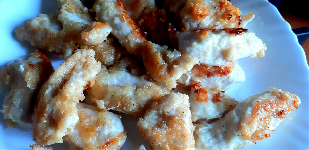 Этот рецепт я увидела где-то здесь, в Дзене. Только наггетсы готовились в духовке, а не на сковороде. Я же делала именно на сковороде. Итак, нам понадобится: куриная грудка, мука, сыр, яйцо, панировочные сухари, соль, перец, другие приправы по вкусу, растительное масло. Все ложила на глаз. Наггетсы у меня активно едят дети, им нравятся они и в кафе, и в магазине, и домашние. Конечно, дома они получаются другими, но тоже вкусными. Первое, что делаем, обрезаем мясо птицы с кости, затем нарезаем его кусочками. Крупные не делаю, на мой вкус, когда они меньше, то вкуснее. Перекладываем кусочки в миску, немного солим, засыпаем мукой, перемешиваем, потом опять перекладываем их в другую емкость, отряхивая от лишней муки. Мешаем яйцо и растительное масло в отдельной тарелке, добавляем соль, специи. Я добавила только немного черного перца, это уж кто как любит, я побоялась, что, если накладу лишнего, дети есть не будут. Когда смесь готова, выливаем ее на грудку, перемешиваем. Теперь соедин