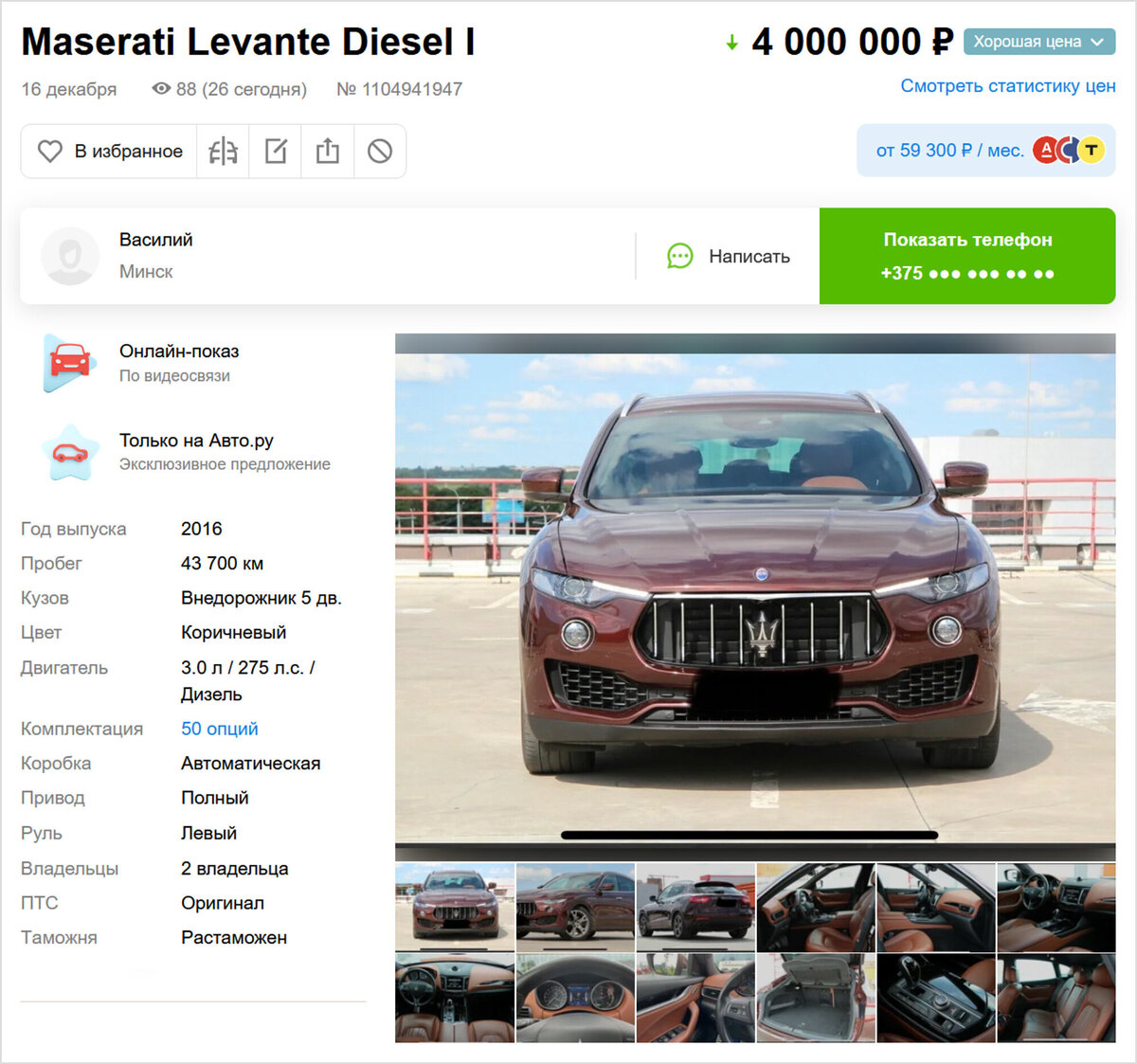 В итоге кроссовер отремонтировали и продали в Белоруссию. Увы, дальнейшая история машины доподлинно неизвестна. Можно лишь предположить, что ДТП не прошло для машины бесследно — судя по тому, что нынешний владелец Levante c лета не может найти покупателя. Хотя 4 млн рублей — это фактически самая низкая цена данной модели на Авто.ру.