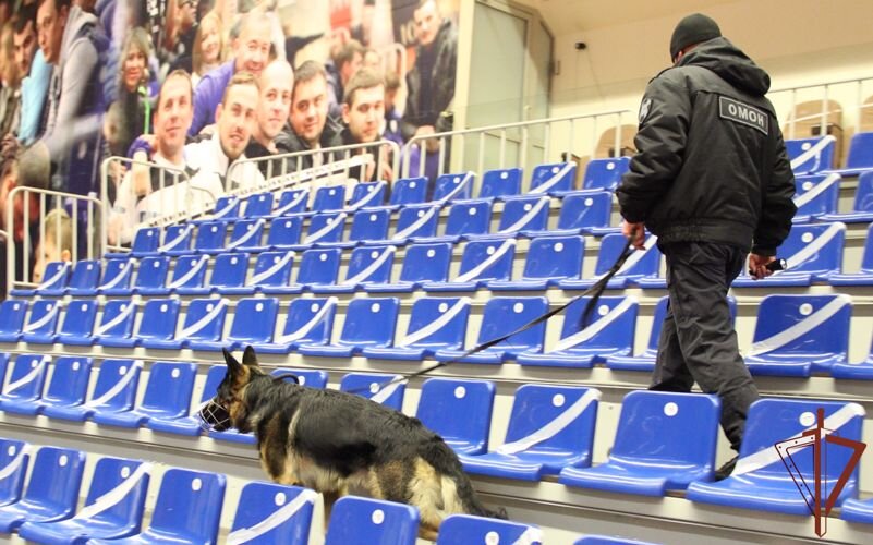Перед началом встреч специалистами инженерно-досмотровых групп ОМОН Росгвардии с использованием специальных технических средств и служебных собак обследованы помещения, трибуны спортивных сооружений, а также прилегающие к ним территории.