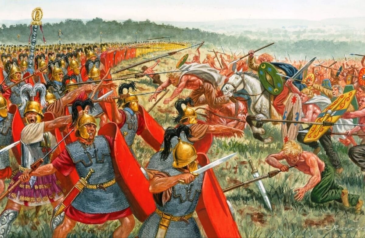 Предыстория Гай Марий сыскал себе большую славу в качестве полководца во время Югуртинской войны. Выбранный консулом в 107 г. до н. э. Марий объявил о наборе римских граждан в войска, набирали независимо от их имущественного ценза. Это позволила быстро пополнять армию. Недостаток в солдатах ощущался уже довольно серьёзно. В то время как Марий достаточно успешно воевал на юге, римские армии несли большие потери на севере, а Италии угрожали варварские племена кимвров, тевтонов и присоединившиеся к ним гальские племена. В 105 г. до н.э. римским легионам было нанесено большое поражение, в тяжкое для страны время римляне обратились к Марию и избрали его консулом заочно. Пока варвары грабили и топили в крови Испанию, Марий подготавливал римскую армию, но в один момент германцы решили разделиться, видимо для удобства снабжения и перемещения. Этим и воспользовался Марий. Силы сторон Историки утверждают, что германцы накануне битвы выглядели как " огромное безбрежное море". Античные авторы на