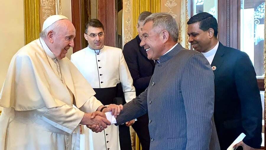 Президент Татарстана Рустам Минниханов в ходе рабочей поездки в Бахрейн встретился с Папой Римским Франциском, сообщает 4 ноября телеканал «Татарстан24». Лидер республики прибыл в королевство для участие в форуме «Значение диалога между религиями», а также для того, чтобы провести ряд важных встреч. «Бахрейн в эти дни принимает у себя представительный и важный форум, посвященный вопросам диалога культур, конфессий и цивилизаций. Отрадно, что такие насущные для планеты вопросы обсуждаются с участием столь высоких представителей, как вы», — сказал Минниханов в начале встречи. Президент Татарстана отметил успехи республики в области сохранения этнического и религиозного многообразия. В частности, он сообщил о воссоздании в 2021 году собора Казанской иконы Божией Матери. «В этом соборе сегодня помещен для поклонения список Казанской иконы Божией Матери, который многие годы находился в личных покоях Папы Иоанна Павла II», — указал глава региона. Он напомнил, что освящение собора возглавил П