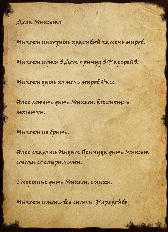 В двух шагах от Нагорья Предателя каджит обнаружил мертвого скампа, а рядом с ним список дел и сумку. Судя по тому, что написано в записке, скампа звали Микгет и он нашел для Насс из Фаргрейва камень миров. Надо забрать камень и отнести его хозяйке. Информация и иллюстрации взяты из клиента игры The Elder Scrolls Online. Навигатор по статьям канала. 1. Забрать белый камень миров. Заберем камень из сумки скампа. Теперь нужно доставить его в Фаргрейв. 2. Найти Насс. Ее мы найдем в Доме Причуд на первом этаже. 3. Поговорить с Насс. Очень занятая Насс надеется, что мы не из тех, кто любит отвлекать от дел без причины. Услышав, что мы нашли камень миров у тела Микгета, суровая дама ничуть не удивится. Для поисков подобного рода Микгету недостает собранности. Он очень старается, но пока не умеет передвигаться с должной сноровкой. Чтобы научиться, ему понадобится не одно тысячелетие. Как и любой даэдра, он умер ненадолго. Может, в этот раз смерть его хоть чему-то научит, а не как обычно. Все
