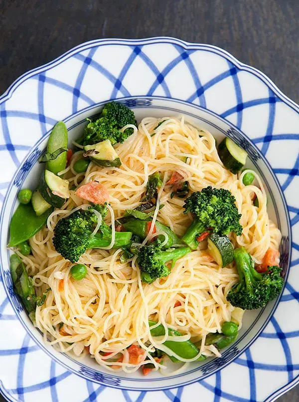 Яркая паста с красивым итальянским названием “Primavera” - в переводе весна! Буйство свежих овощей (брокколи, цукини, спаржа, помидоры, молодой стручковый горошек) в перемешку с тонкой пастой, под легким нежным сливочным соусом и тертым пармезаном. Это оригинальный рецепт пасты Примавера, такой каким он появился впервые в ресторане Le Cirque в Нью-Йорке в конце 1970-х годов и завоевал сказочную популярность! В нем используется паста капеллини или, как ее еще называют “волосы ангела”, она очень тонкая, что делает блюдо еще нежнее. Такая паста готовится за считанные минуты, поэтому не делайте ее до тех пор, пока соус не будет готов, паста капеллини должна сразу перейти от кастрюли к тарелке. Ингредиенты: Способ приготовления: 1. Подготовьте большую кастрюлю с кипящей водой. Посолите хорошенько. Отдельно подготовьте большую миску с ледяной водой. Варите брокколи в течение 1 минуты. Добавьте спаржу и варите еще минуту. Добавьте стручки молодого горошка и варите еще 30 секунд. Удалите все