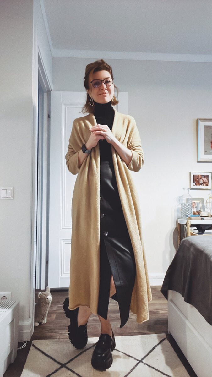 Итак, герой нашей рубрики #генеральский_вязаный_лучок - кардиган- халат. Такой можно легко связать самой руками или на машинке. Мой связан на машине Мариной Сорокиной (@Angry_pelmenator) Ширина изделия 60 см (полочки по 40 см). Длина изделия 120 см. Мои параметры рост 170 см, 88-58-88. Я без макияжа и прически. Фото на телефон в условиях очень низкой освещенности (в Москве зима). Пряжа от магазина dolcefilato.com Машина 7 класс , связано в одну нить, вес примерно 360 гр Помним, что я не стилист, не фэшн-блогер. Я специалист по вязанию и оттого в моем шкафу масса вязаных вещей и в данной рубрике я транслирую исключительно свой опыт, поскольку многим подписчикам нравится как я одеваюсь. Итак, с чем я его буду носить? Я сейчас не рассматриваю версию зимы (плюс пальто и сапоги), поэтому беру демисезонную обувь без каблука и не кроссовки. Поближе к классике на каждый день, так сказать. Зиму не делаю ибо картинок будет миллион 🙈 Самое простое - все одного цвета 😁 На самом деле я просто