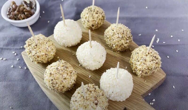 9. Теперь достаю сырные шарики из морозилки, они уже порядочно подморозились, тщательно обваливаю их в перемолотых орехах и в кунжуте. Это не обязательно, так как может перетягивать на себя вкусовой акцент и не всем придется по вкусу.