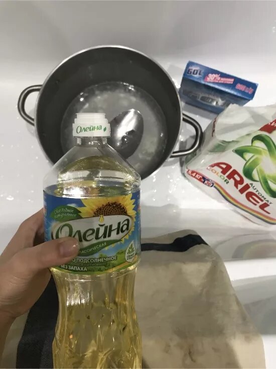 Нагрейте воду до 60 градусов. Все компоненты добавьте в горячую воду. Масло последним, это очень важно. Все тщательно перемешайте и положите вещи в воду. В данном растворе белье должно пролежать не меньше 10 часов, после чего стираем и хорошенько поласкаем в машинке.