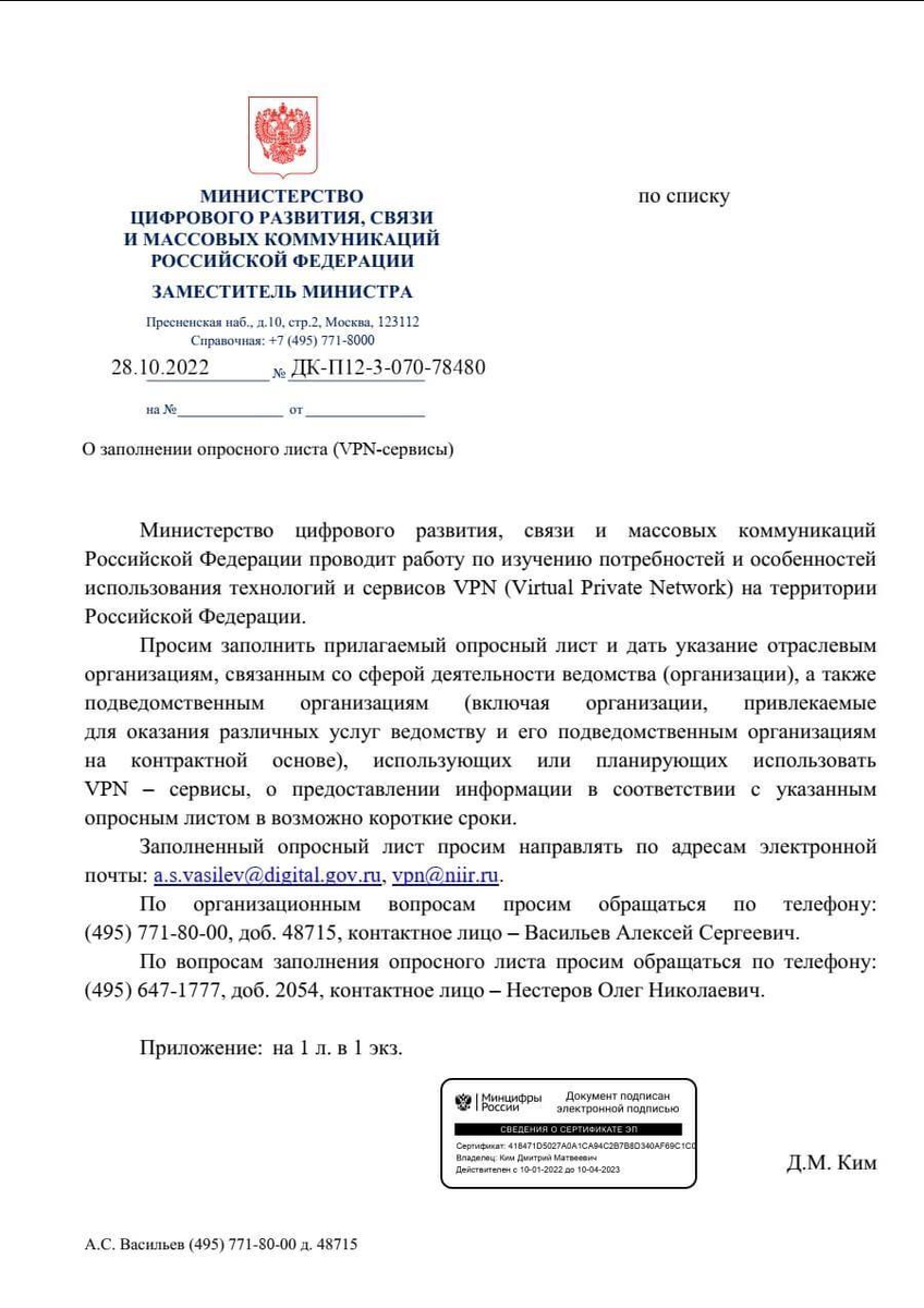 Министерство цифрового развития РФ приступило к изучению потребностей и особенностей использования VPN в стране. Соответствующий опросный лист ведомство уже направило в отраслевые организации с просьбой заполнить в короткие сроки.
