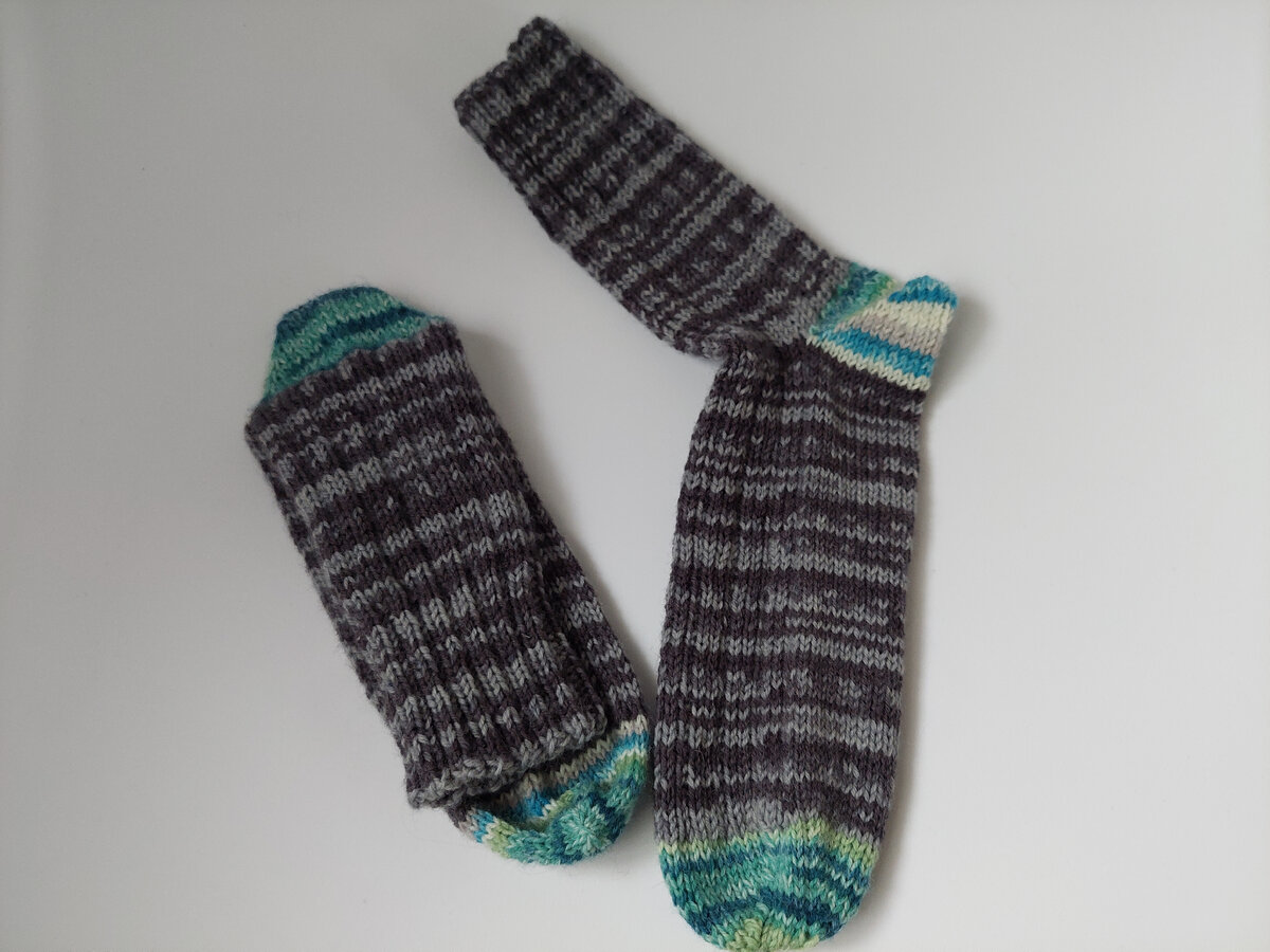 Недавно связались очередные носочки. Подружила в них пряжу двух разных расцветок. По-моему получилось неплохо. Начинала вязать носок резинкой 2×2, затем перешла на резинку 3×1,после вывязывания пятки-бумеранг продолжила вязать резинку 3×1 только с одной стороны, стопу и пяточку вывязывала лицевой гладью. С носками я ещё не закончила, продолжу вязать пока есть пряжа. Надеюсь зимой будут актуальны, хотя и сейчас их периодически носим дома. Стираю, как и написано в рекомендациях, в стиральной машине.