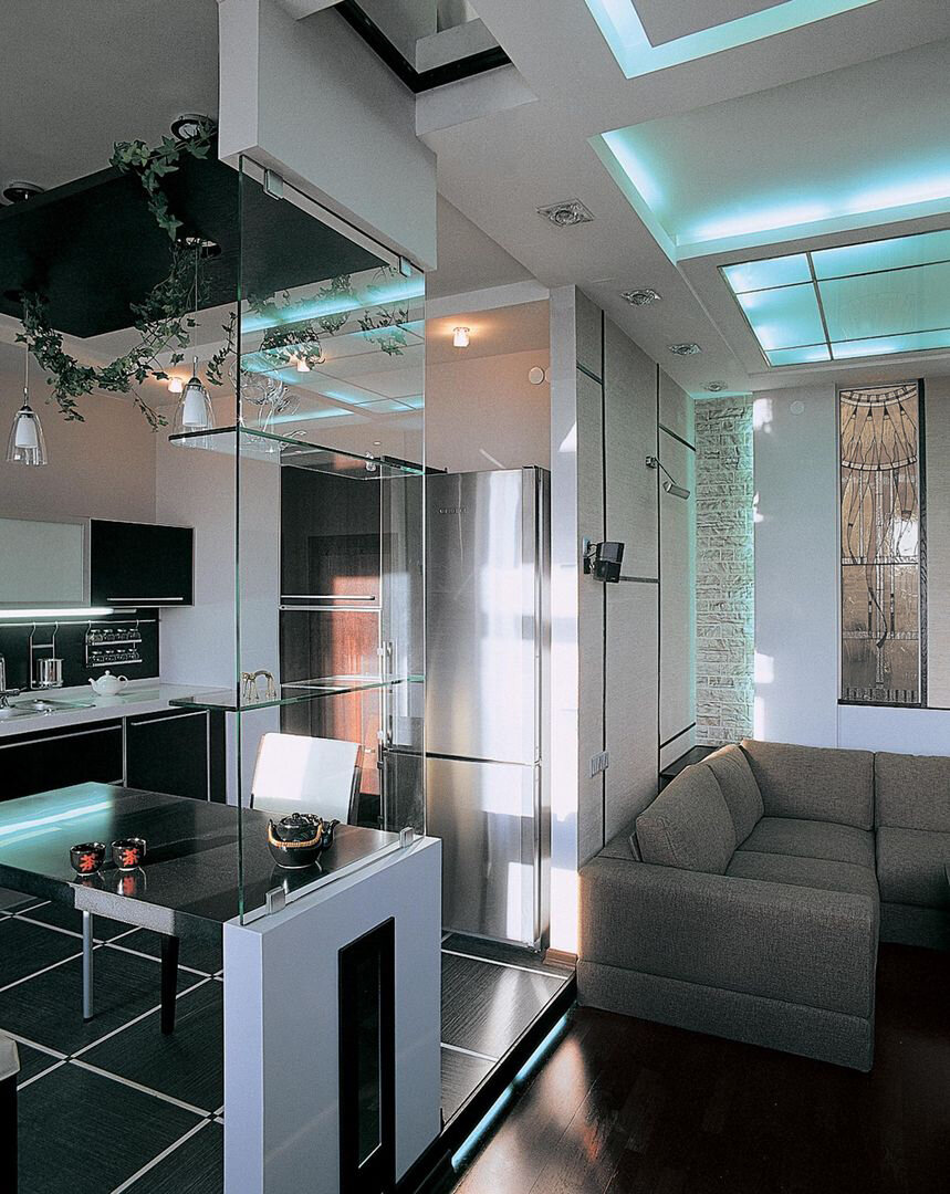 Дизайн квартиры - в котором строгая геометрия не выглядит скушным минимализмом. Удалось сделать красивую систему - с подсветками подиума пола, уровней потолка и витражей - поэтому пространство выглядит строго, но стильно. Для разделительной перегородки заказывалась композиция из стекла с полками и отдельными элементами из темного дерева. Впотолке установлено зеркальная плоскость. Графичные линии на полу кухни хорошо кореллируют с темными полами гостиной и декором стен.